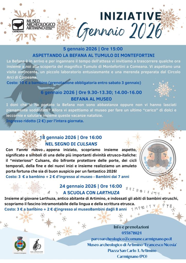 La Befana è in arrivo e per ingannare l’attesa vi invitiamo a trascorrere qualche ora insieme a noi alla scoperta del magnifico Tumulo di Montefortini a Comeana. Vi aspettano una visita avvincente, un piccolo laboratorio entusiasmante e una gustosa merenda preparata dal Circolo Arci di Comeana.
