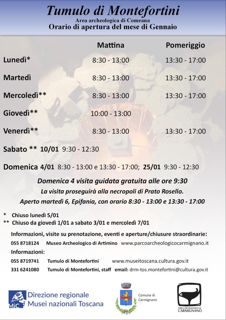 Nel mese di gennaio 2026 il Tumulo Etrusco di Montefortini sarà aperto, con ingresso gratuito,  nei seguenti giorni ed orari: