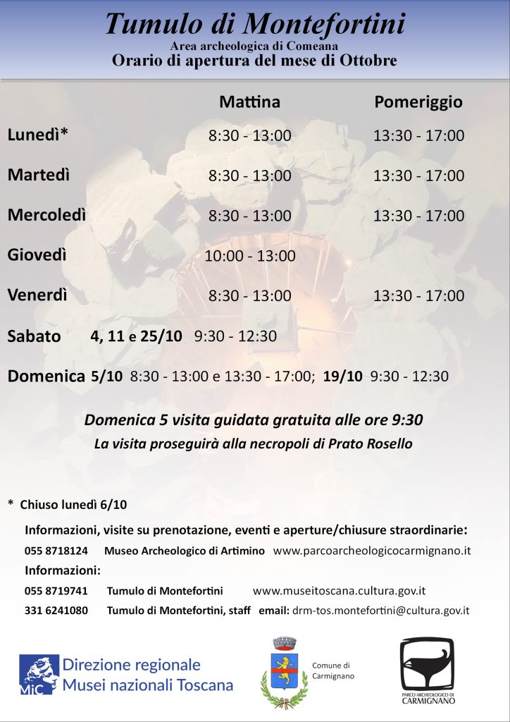 Nel mese di ottobre 2025 il Tumulo Etrusco di Montefortini sarà aperto, con ingresso gratuito,  nei seguenti giorni ed orari: